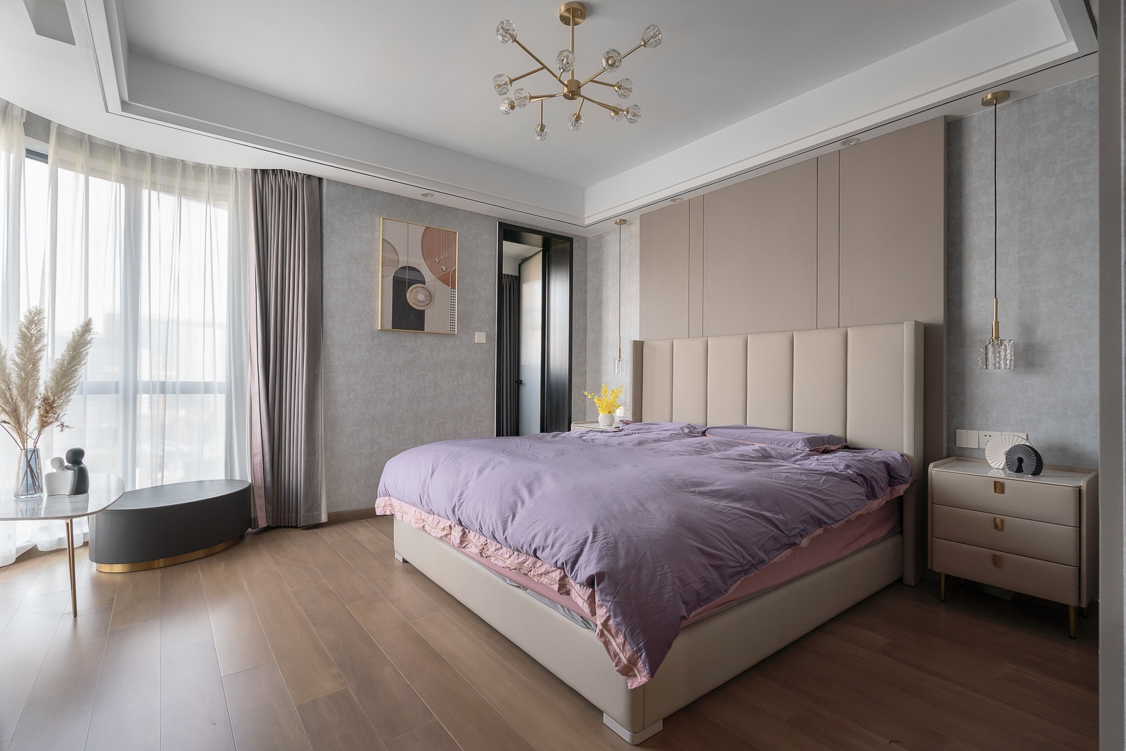 主臥以花灰色作為背景色,床頭背景墻處用木色硬包進(jìn)行點(diǎn)綴,墻上簡(jiǎn)單的線條造型與軟包床呼應(yīng),讓空間簡(jiǎn)約有余,而不覺(jué)單調(diào),且與壁燈相互呼應(yīng)。