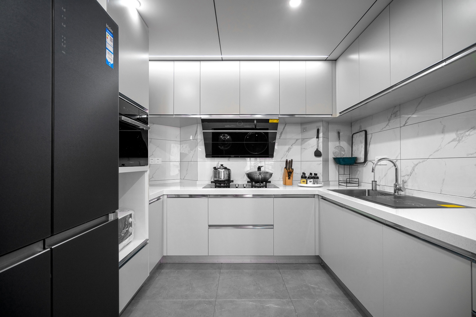 廚房采用U字型布局,動(dòng)線合理,收納充足,空間也得到了有效利用。