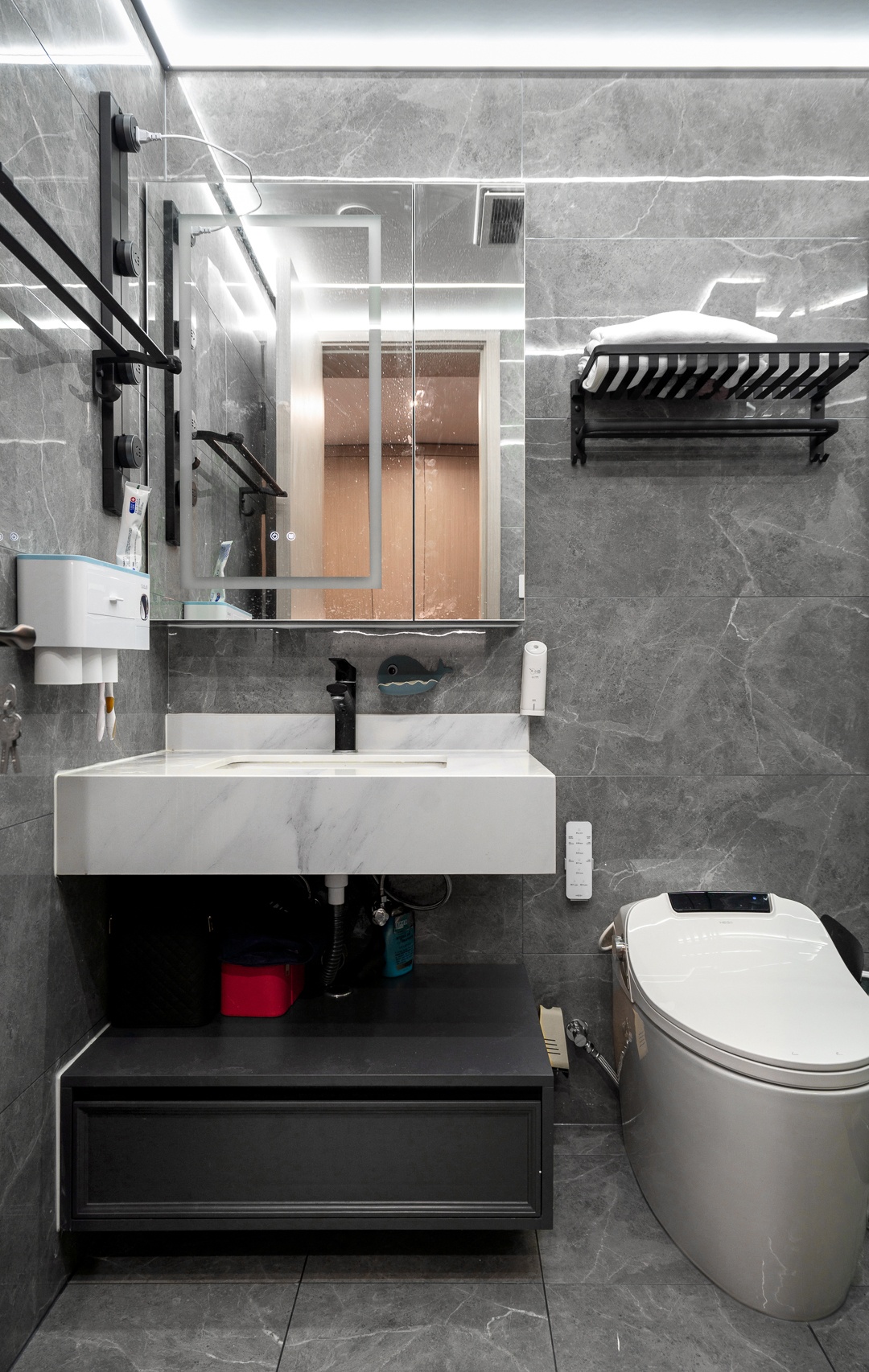 灰色系的衛(wèi)浴空間時(shí)髦腔調(diào)十足,配合燈光氛圍感,營(yíng)造出小而精致,且不失溫度的舒壓空間。