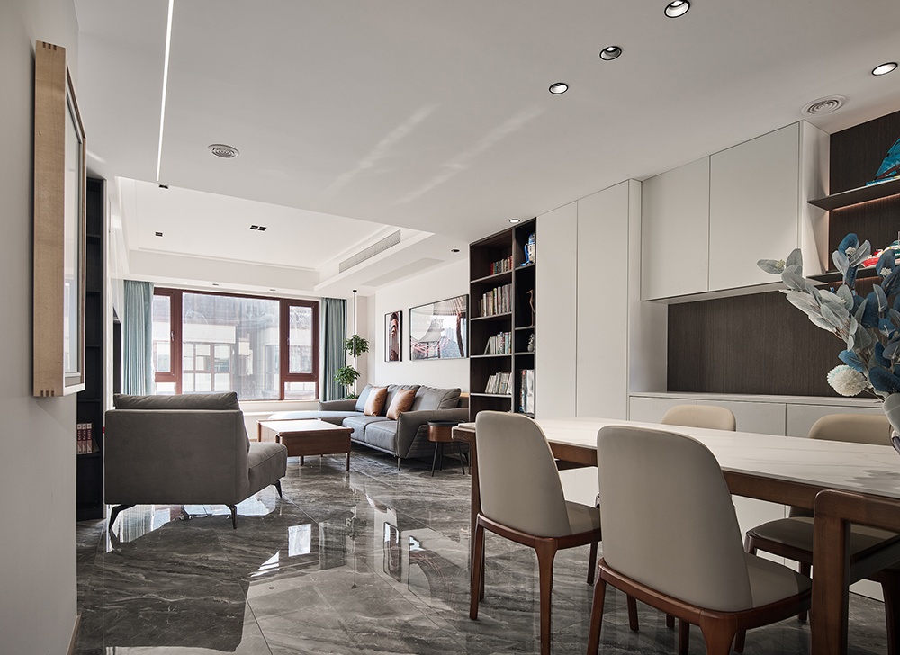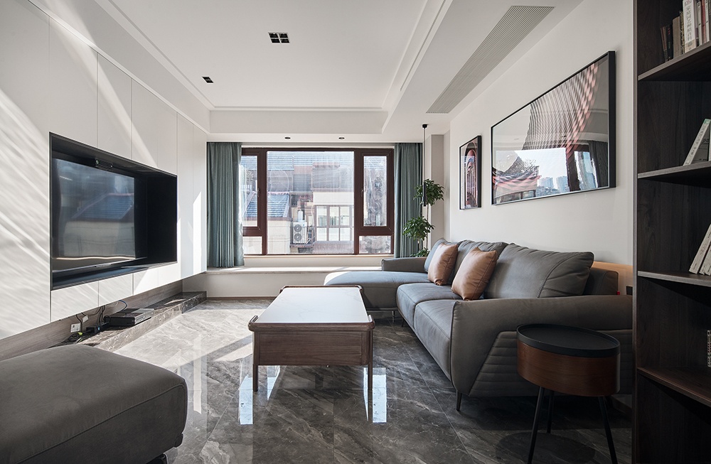 客廳采用無主燈設計,使視野更加開闊。電視墻則為整體設計的定制收納柜,雖然犧牲了客廳的一部分面積,但卻極大的增強了家庭的收納空間。