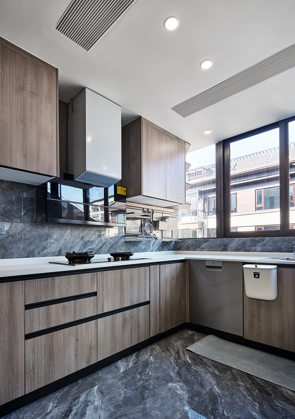 廚房空間以實用為主,烤箱蒸箱皆被嵌在柜體之中,保持空間的統一性,讓廚房顯得簡約又有功能感。