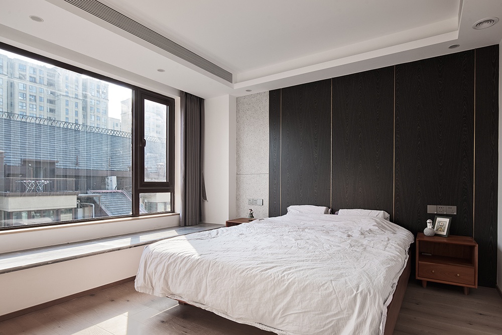 純粹是主臥給人的第一感受,空間以干練的黑白為主色調,嵌入精致的金屬線條,突出空間的層次感。