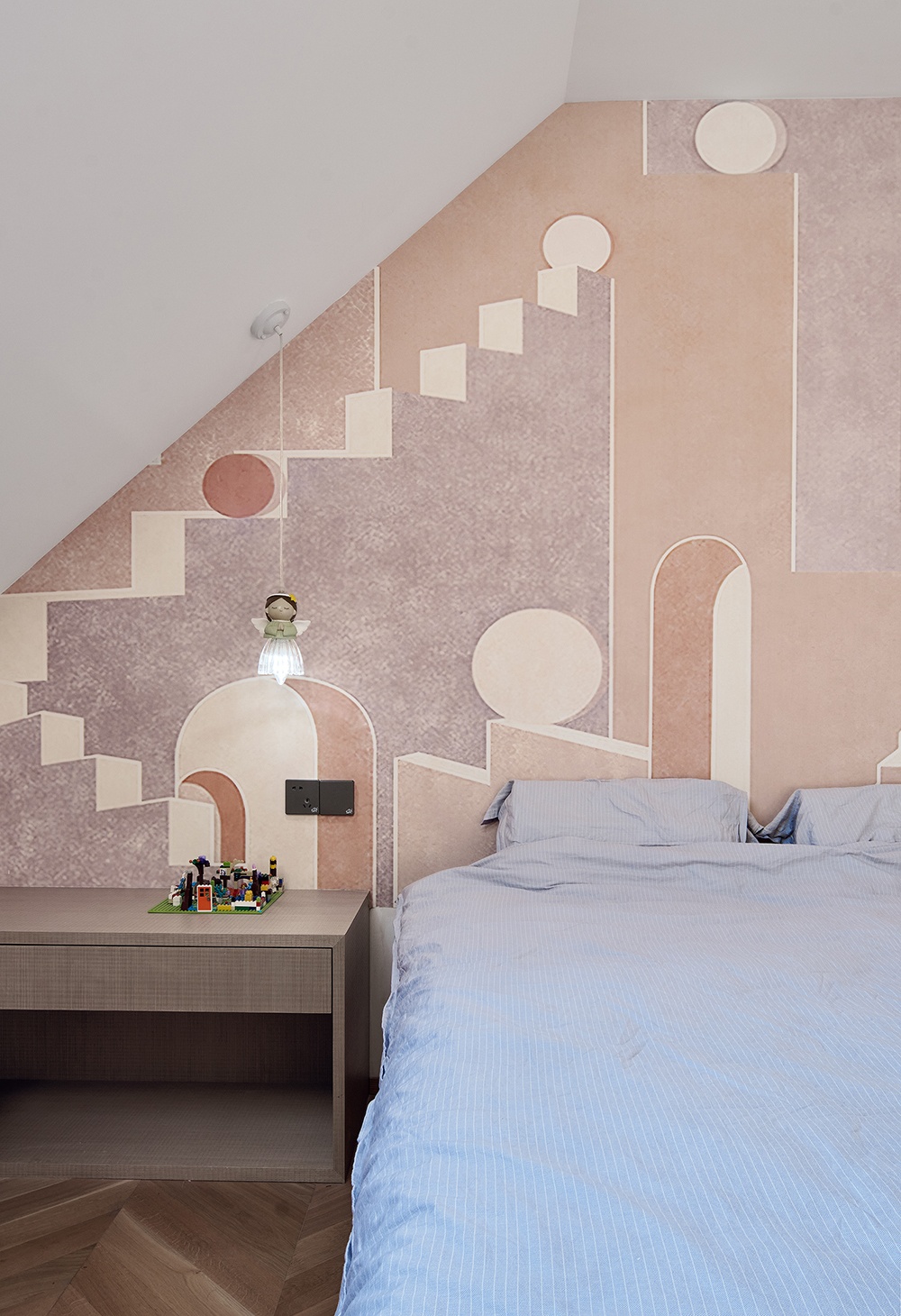 頂層屬于這家的小公主,米白搭配粉色再填入大量的木質元素,整個空間氛圍恬靜且可愛。
