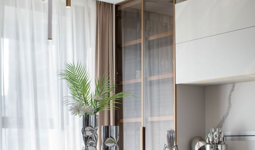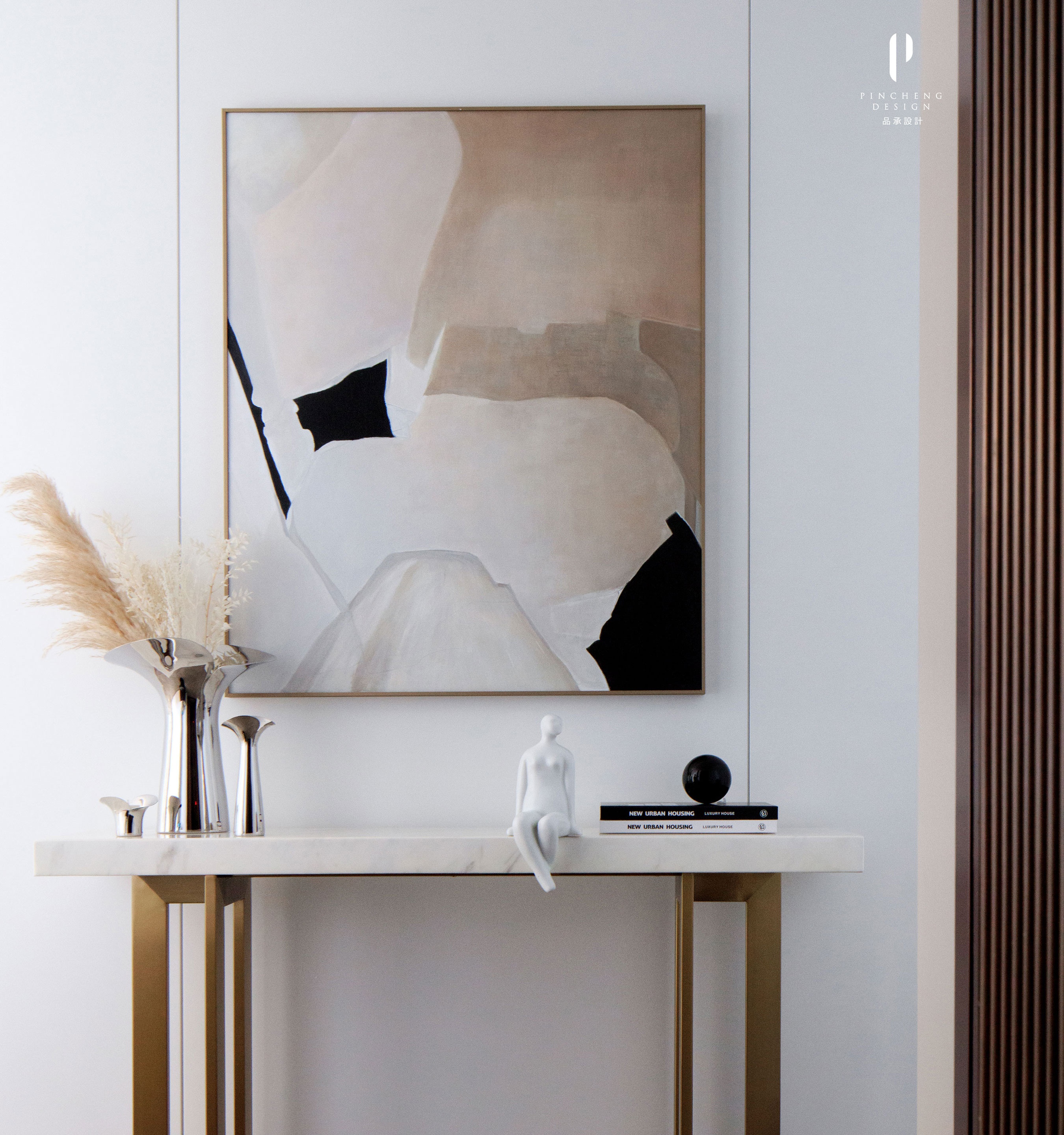 獨立的玄關以個性端景臺作為承載,開啟歸家的儀式感。入戶的第一視覺,便能直觀感受到靜謐氣息。放眼望去墻面一副簡約的抽象畫如藝術一般獨特,簡而溫潤的色澤,似時光荏苒后安靜又內斂的沉淀之美。