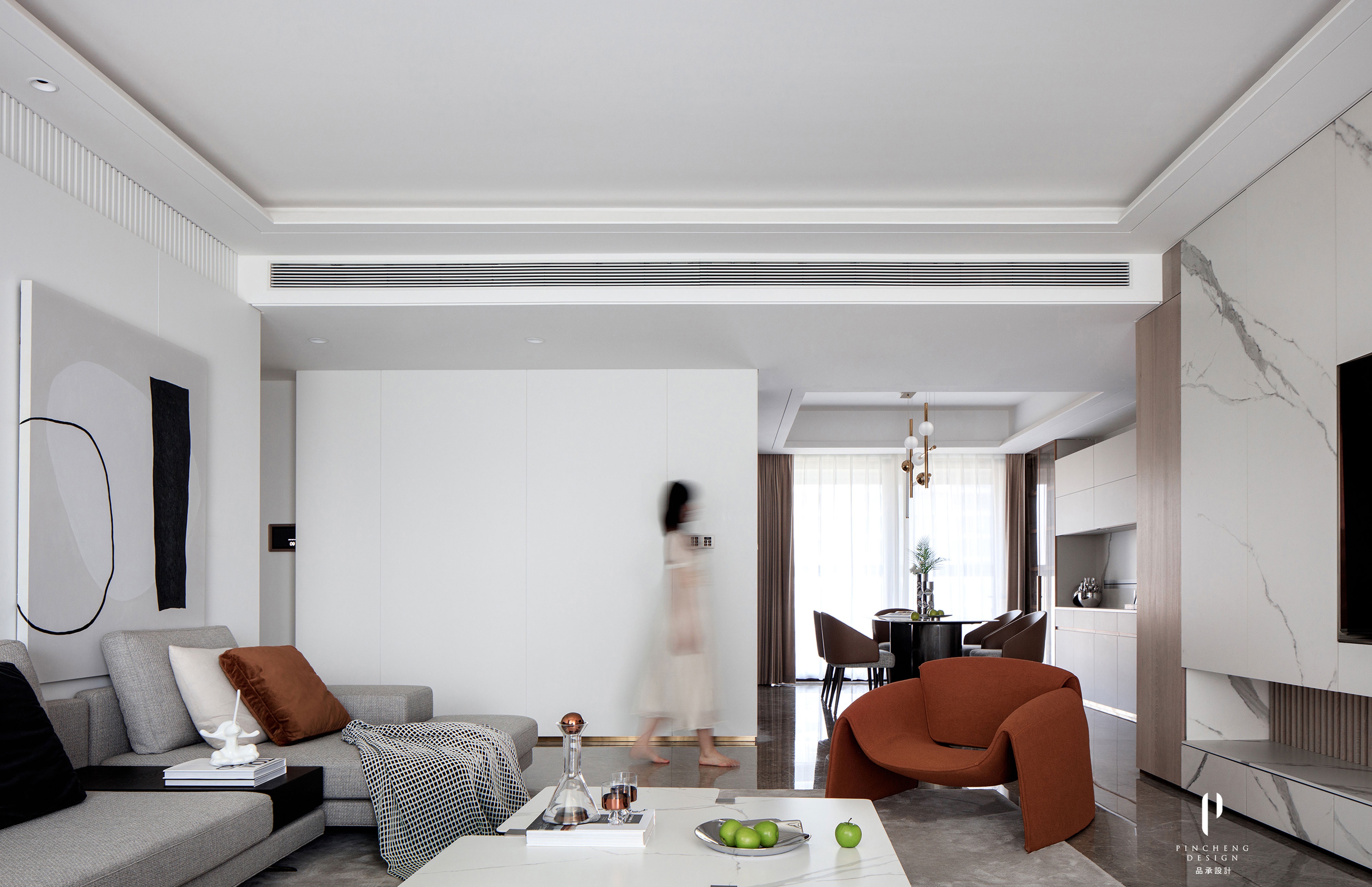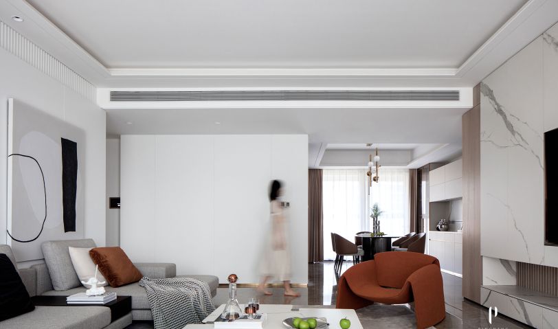 客廳不加修飾的白色背景墻通過錯層形式豐富視覺效果,個性的家具提升了整體空間的調性。灰色的沙發具有超級精致的視覺感受和舒適體驗,灰與白的界限中,融入橙色的單體沙發,在空間中劃出鮮明色調,多了些許生活的溫度,與空間完美契合。