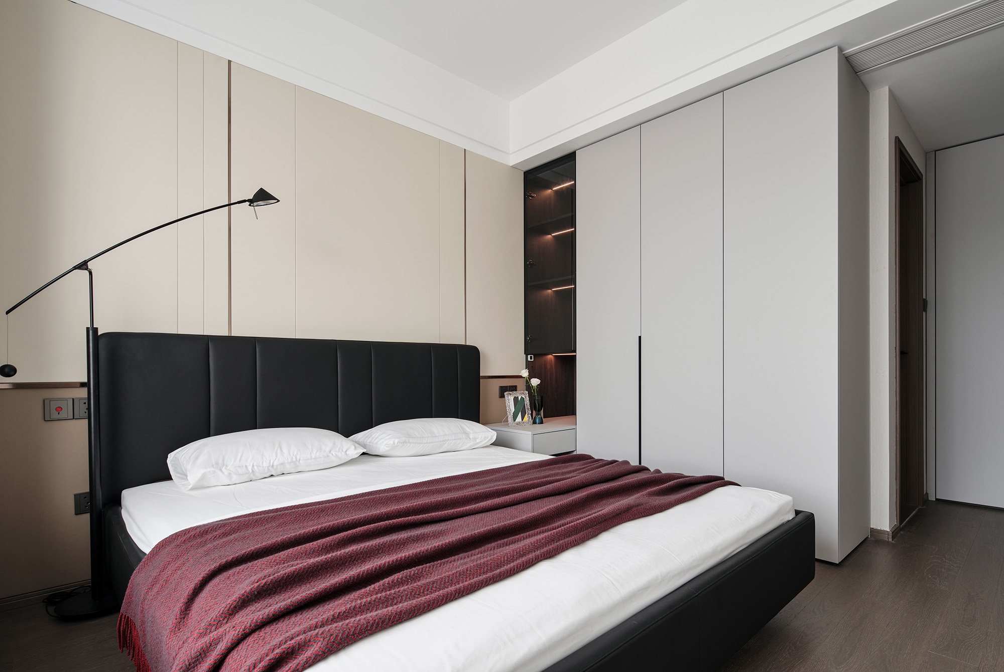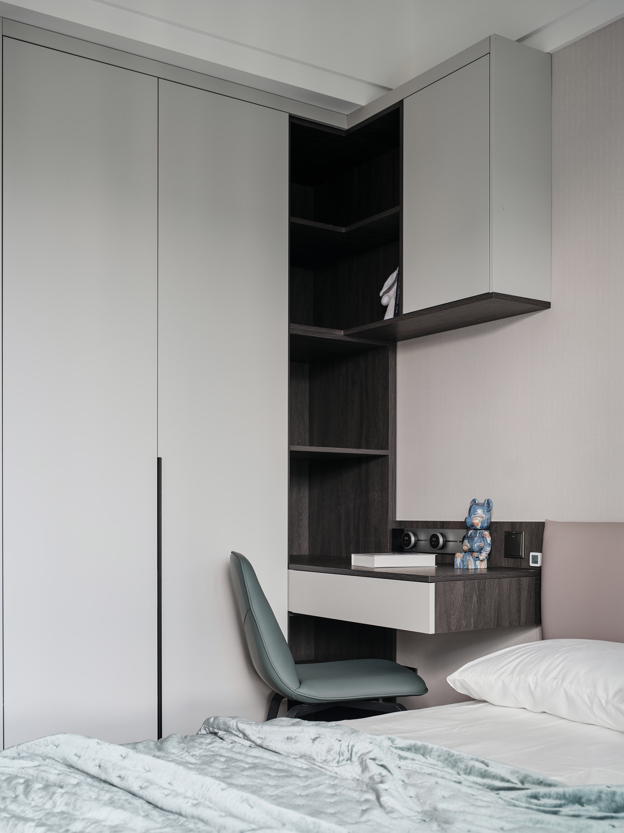 選用暗色調(diào)加強(qiáng)空間的簡(jiǎn)雅質(zhì)感,借細(xì)膩木紋為睡眠環(huán)境嫁接親密性,串聯(lián)富有情調(diào)的布藝,隨著豎向線條的分割、轉(zhuǎn)折、排列,流露出沉靜的氣氛。定制通頂柜體保持統(tǒng)一美感,布置層架細(xì)節(jié),表達(dá)收納和展示的趣致。