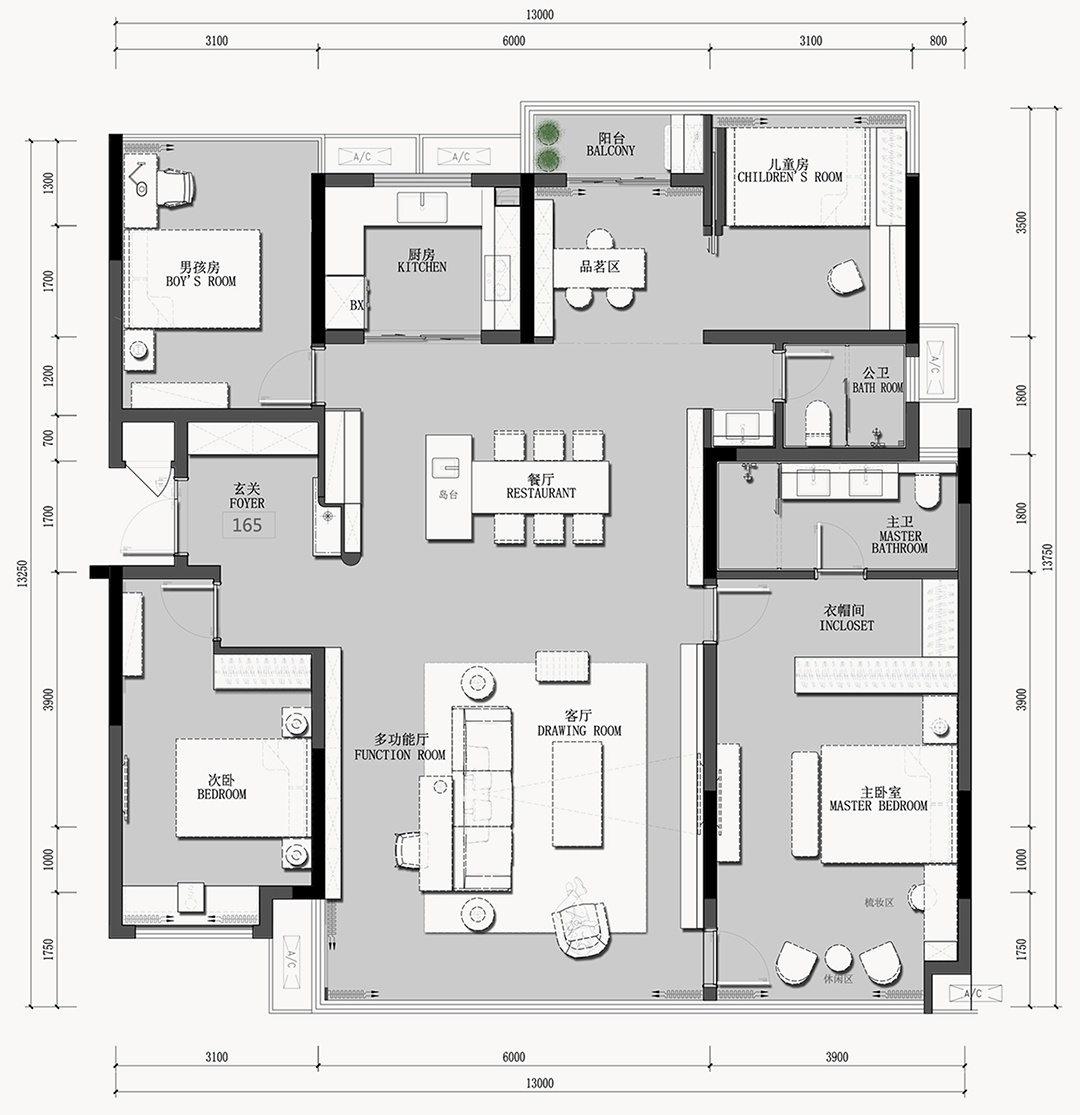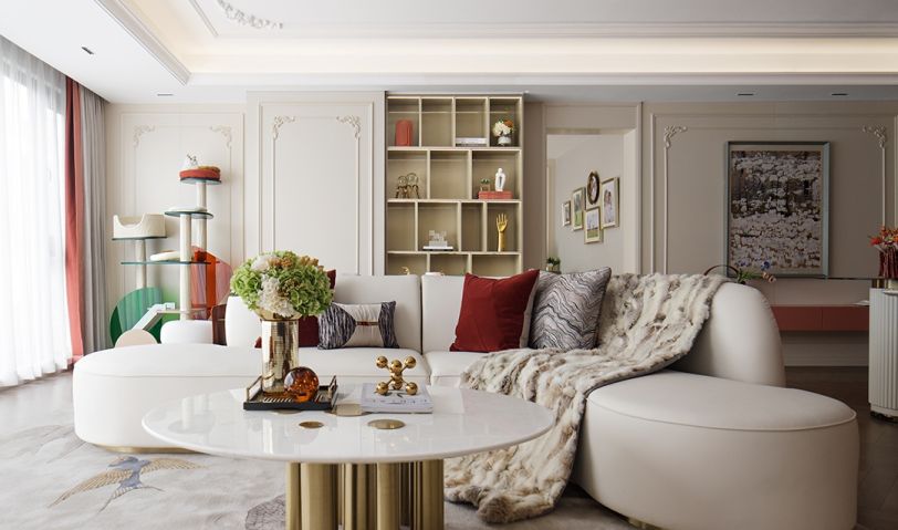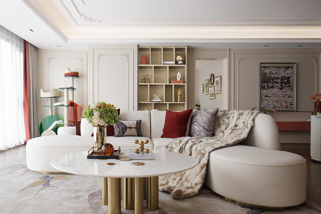 125㎡戶型實體樣板間,整體以灰白為基調,經典的朱紅與灰白碰撞,形成大膽強烈的色彩對比,展現出一種簡約精致的生活態度。設計師靈活借助材質、光影、線條,營造時尚優雅的空間感受。