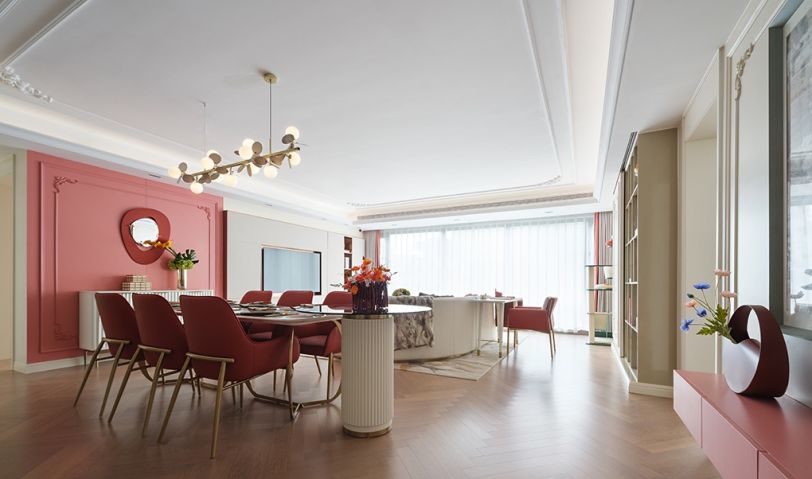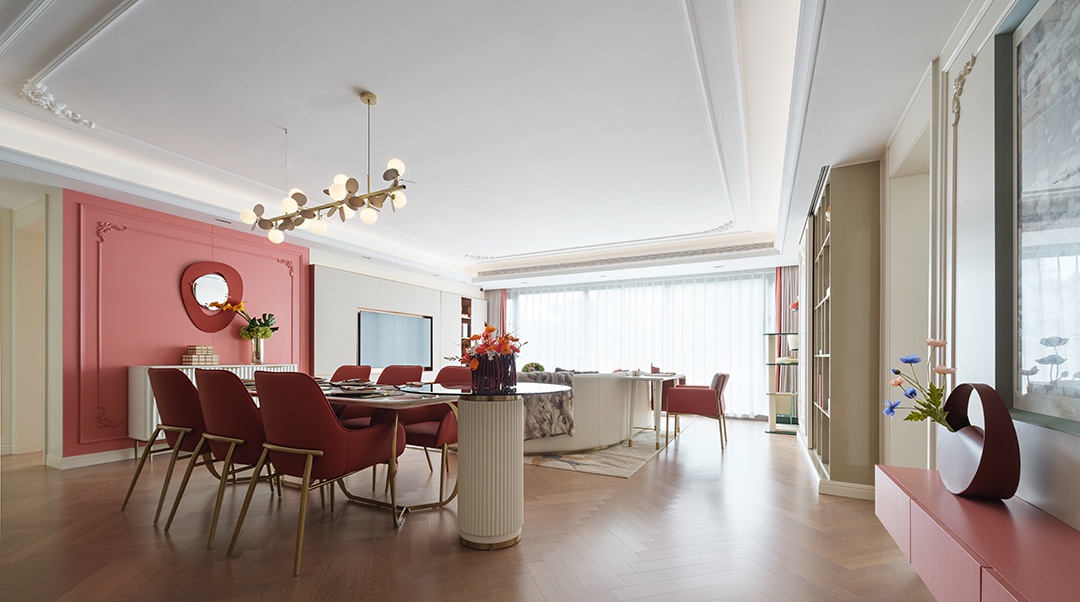 粉色背景墻自然地將餐廳從客廳中劃分出來,融入溫馨浪漫的情調。金屬大理石餐桌搭配朱紅色皮質餐椅,豐盈了空間的層次感。藝術吊燈與花藝上下呼應,讓人感受到三餐四季里的安然與詩意。