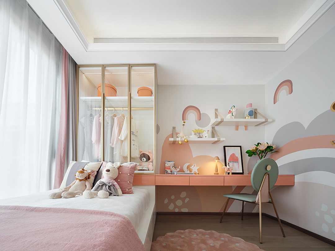 女兒房呈現出更為柔和的調性,淺粉色與淺藍色碰撞,幾何藝術在空間穿插,營造出恬靜柔美、充滿奇幻的溫馨氛圍。
