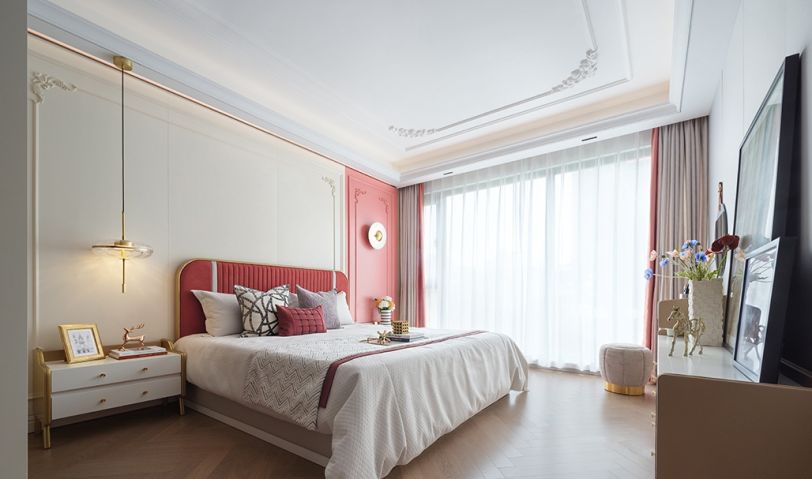 主臥延續了客廳的風格,灰白調搭配原木地板,點綴朱紅、粉色與金屬材質,營造優雅時尚感。天花及背景墻上華麗的簡歐式線條,與幾何造型的燈具搭配,散發出雅致舒適的休憩氛圍。