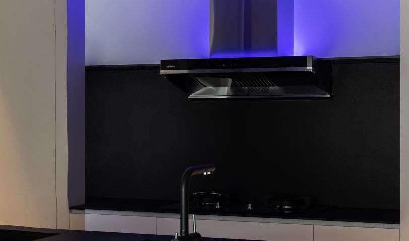 利用入戶左手邊墻體深度差,打造玄關(guān)儲物柜,與櫥柜一體,整體感強(qiáng)烈;