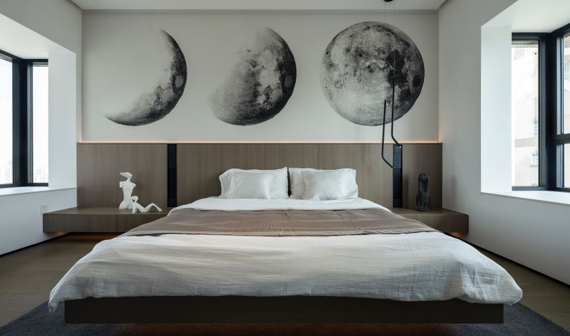 主臥延續(xù)整體風(fēng)格,背景墻定制木飾面及床頭柜作為裝飾,兼顧實(shí)用性,視覺上更為溫和,清爽白墻作為底色,保留極簡的利落之感,上半墻為定制的裝飾畫,圓缺時令不一的月球彼此交相呼應(yīng),逼真感讓月球猶如實(shí)體,增加空間感。