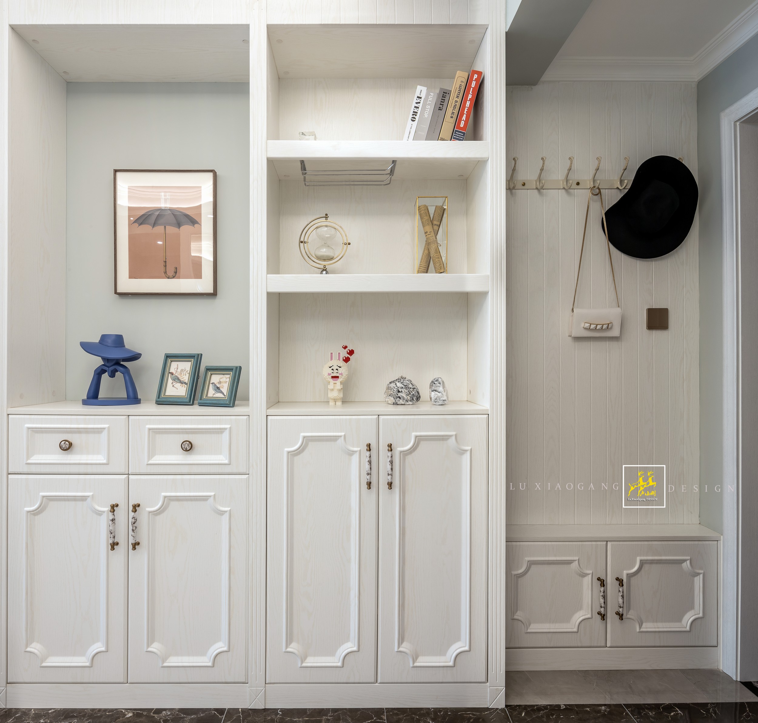 玄關處的柜子與護墻版集成一體,搭配白色的衣帽掛鉤更加方便適用。富有質感的羅馬柱,加上鞋柜與酒柜的設計,集展示與收納功能于一體,完美的融合了藝術性與實用性。