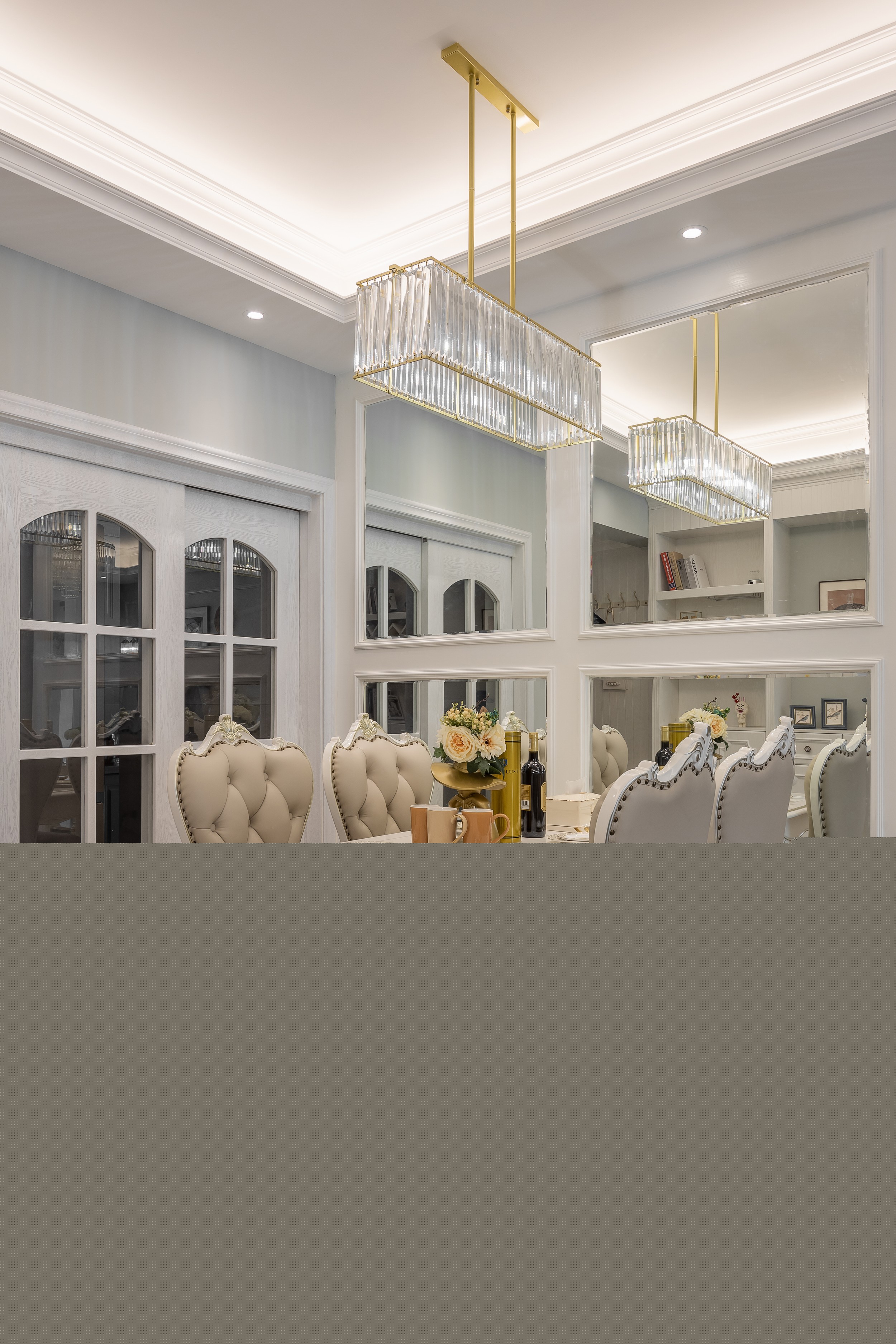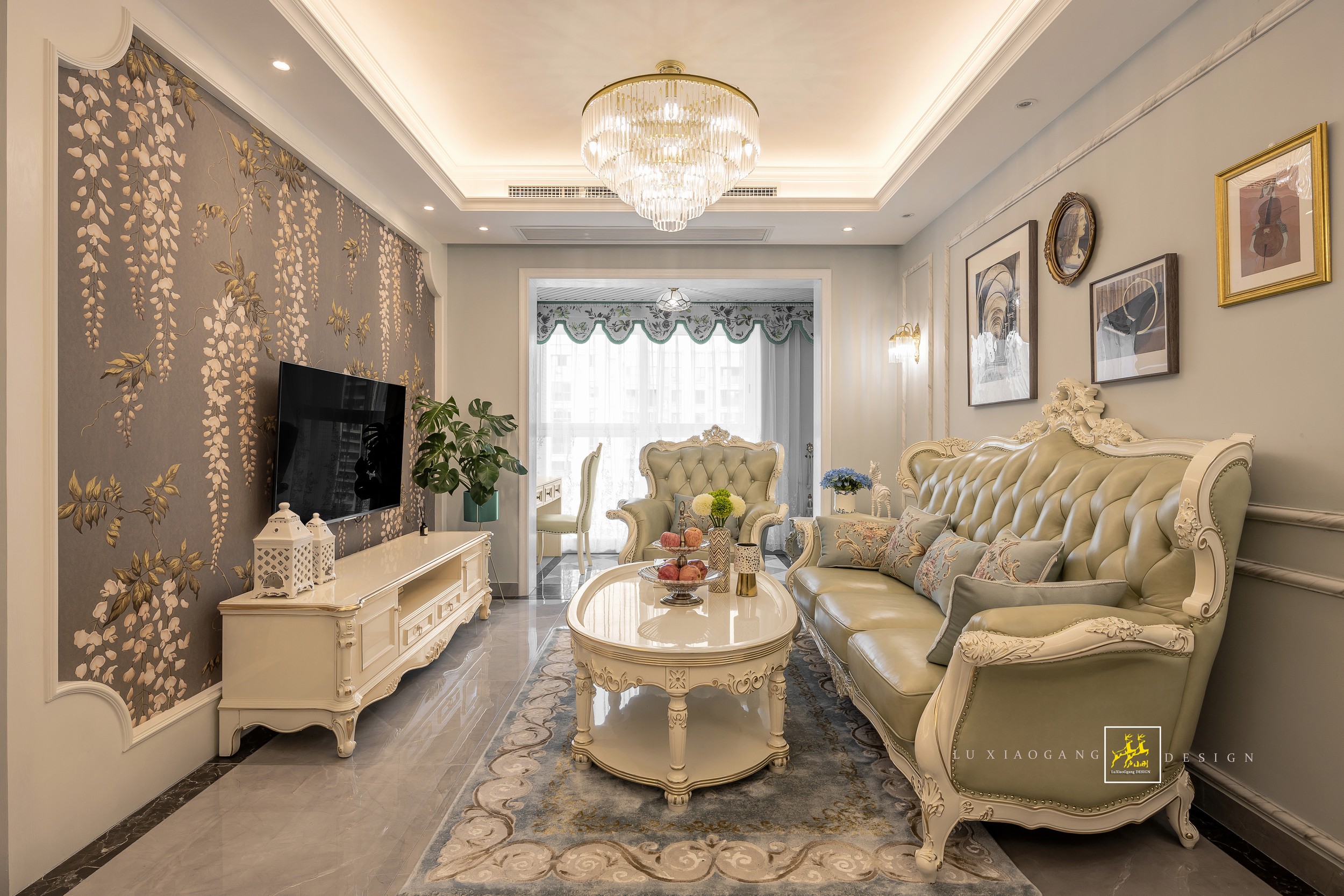 穿過玄關進入客廳,客餐廳空間的無障礙銜接,增加了空間的延續性。客廳的整個空間采用了淺色系復古色調,打造出了別樣的暖系歐式浪漫。