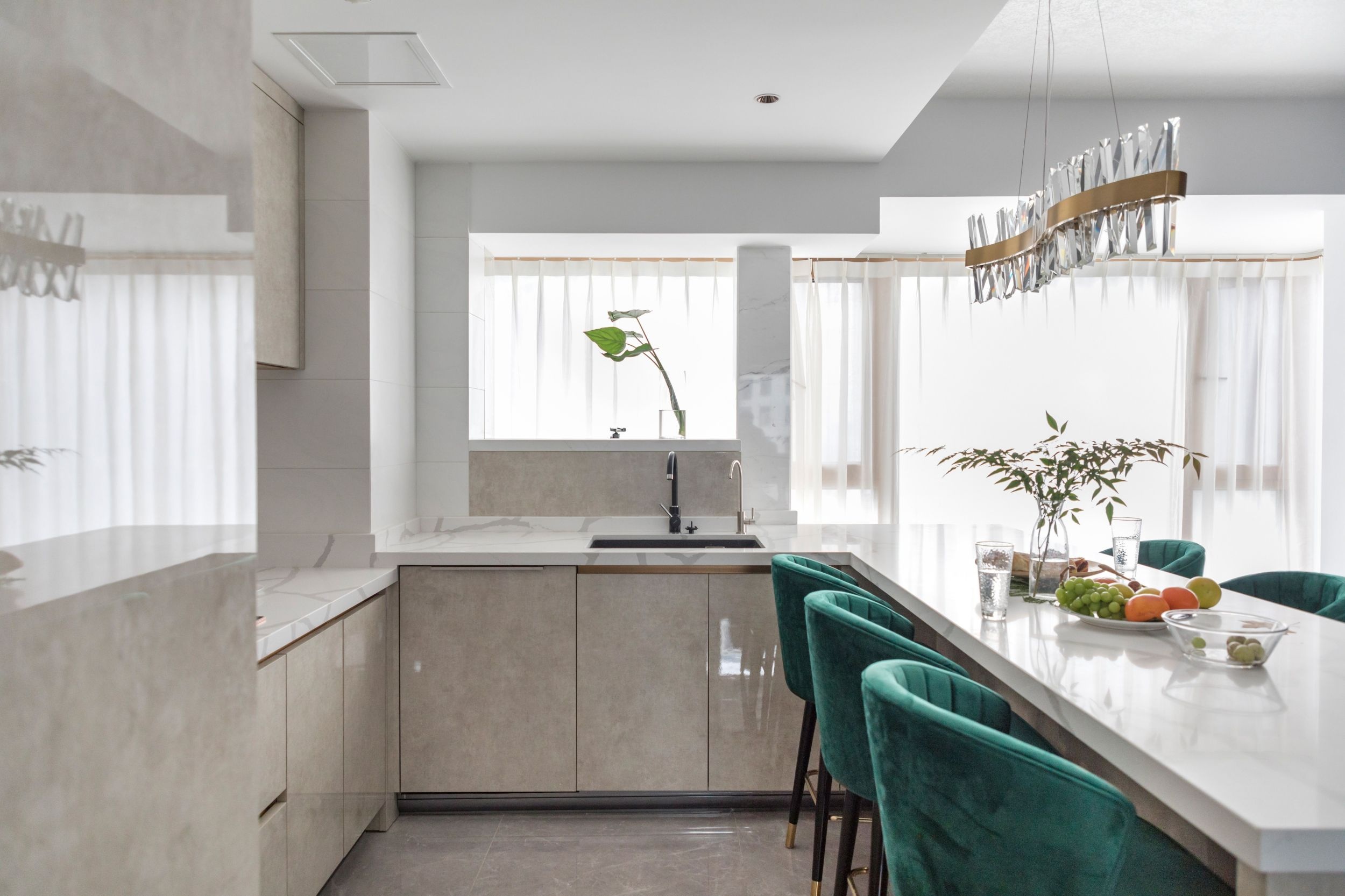 開放式廚房中間的島臺兼具用餐以及會客功能,右側將冰箱、烤箱等設備嵌入收納墻中,設計感滿滿的同時,也提升了空間的功能性。