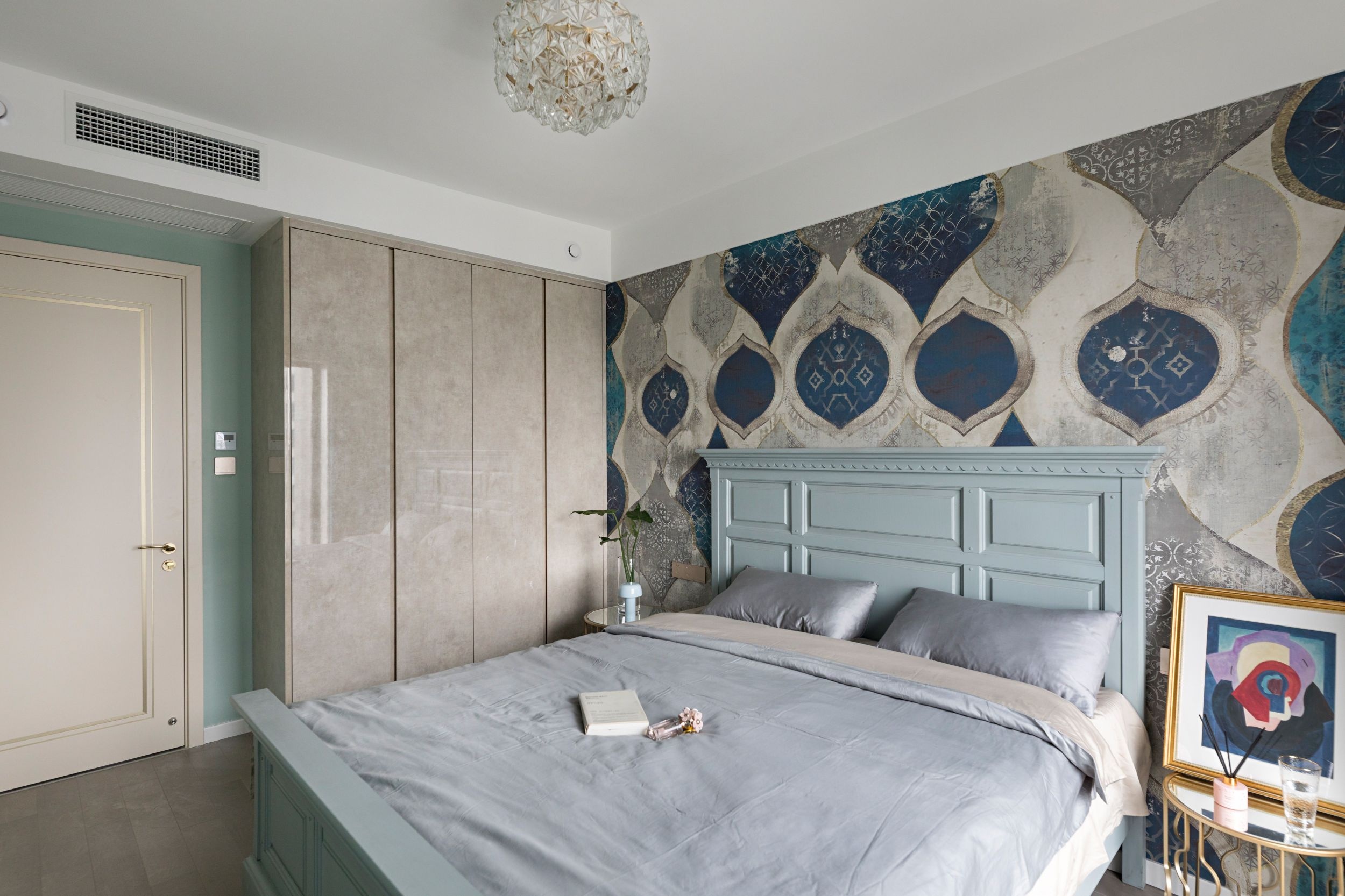 次臥大膽的搭配打破常規(guī),圖案大氣又不失美感的壁布與床體的湖藍色形成碰撞,讓屋子仿佛有了靈氣,讓人耳目一新。