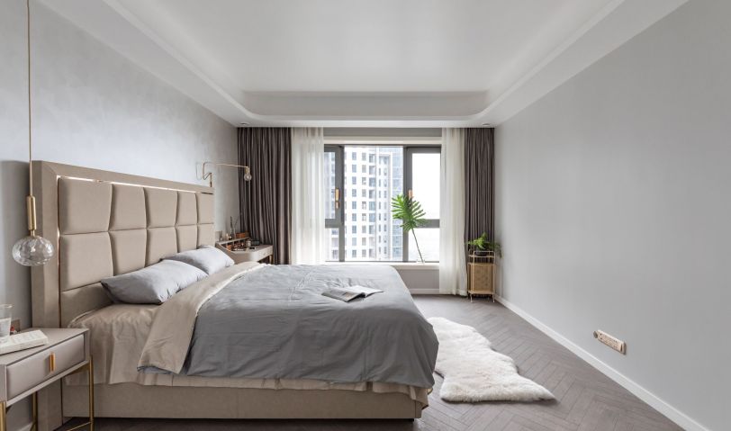主臥休息區(qū)與衛(wèi)浴區(qū)分明又相呼應。地面材質的分割避免了衛(wèi)浴區(qū)水侵泡地板的可能,細節(jié)的處理用收口邊條阻擋了水的蔓延。主臥采用無主燈設計,同時主臥背景墻采用跟客廳頂部一致的藝術漆,讓空間的設計元素得到延伸,整個空間顯得干練又明快。