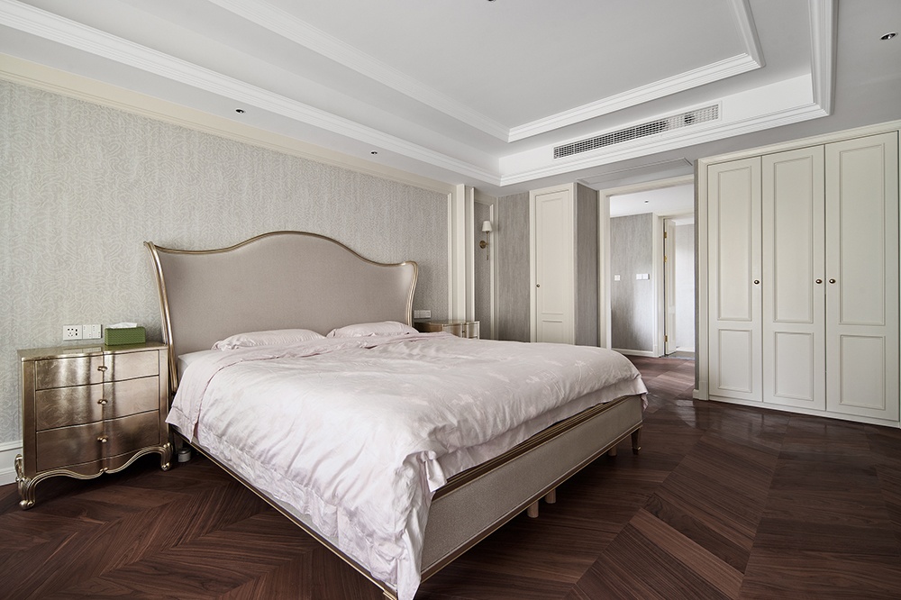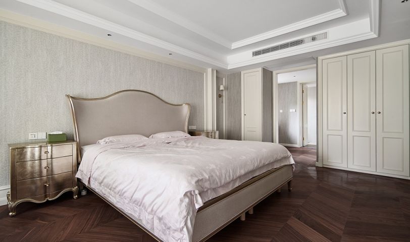 女孩偏愛粉色,木質紋路的粉色墻壁與深色木地板相配,溫柔大氣。以金屬裝飾的床頭柜更是將法式風情拉滿。