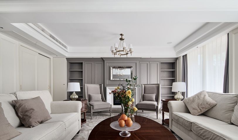 客廳以灰白為主色,簡單干凈,與深木色質的柜子在空間中交融而亮眼,多燈泡大燈在天花板上垂吊,賦予整個空間一種靜謐之美。