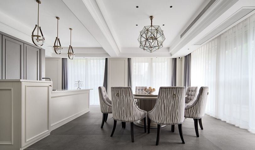 餐桌與背景墻間預留出的空間以西廚島臺進行填補,將餐廳的功能性提升至最大。內嵌的家用電器,更是將可用空間最大化。