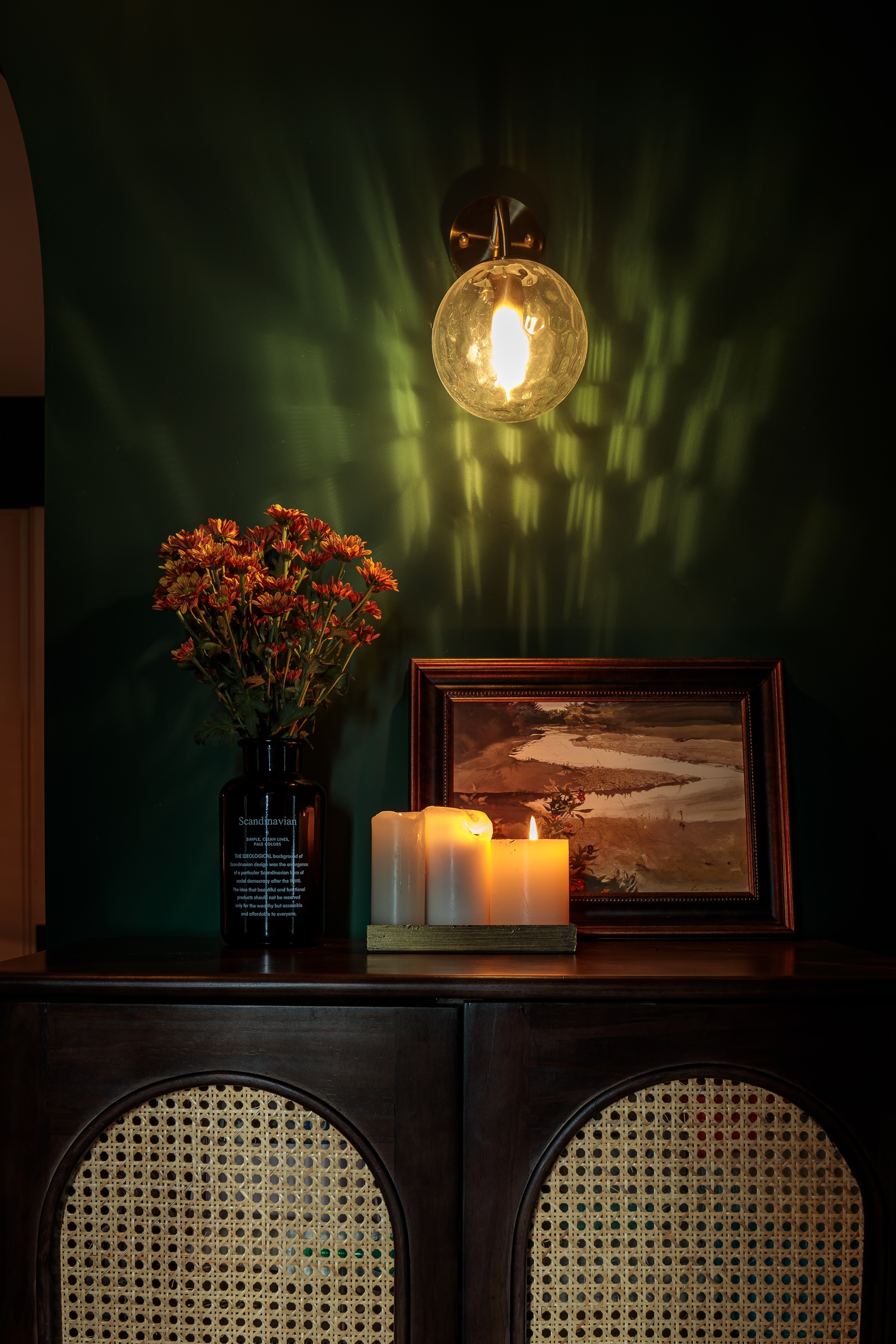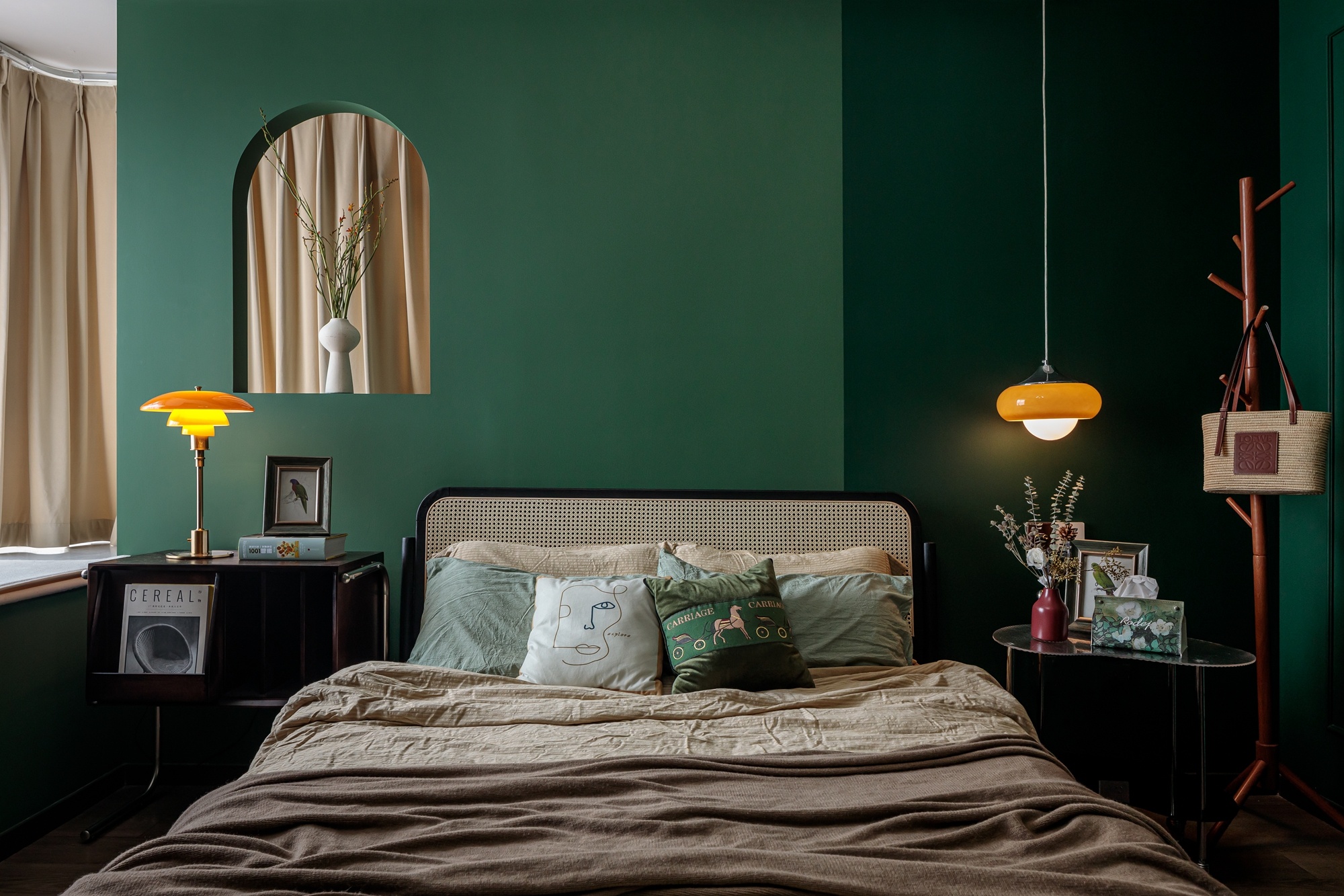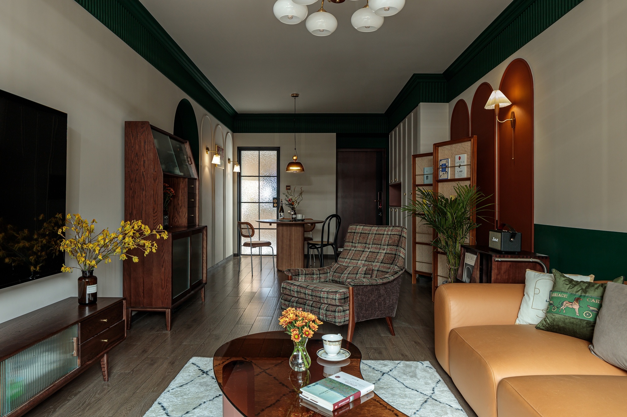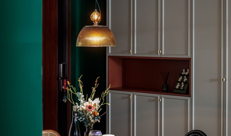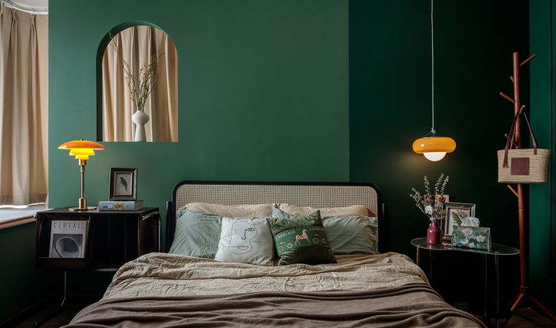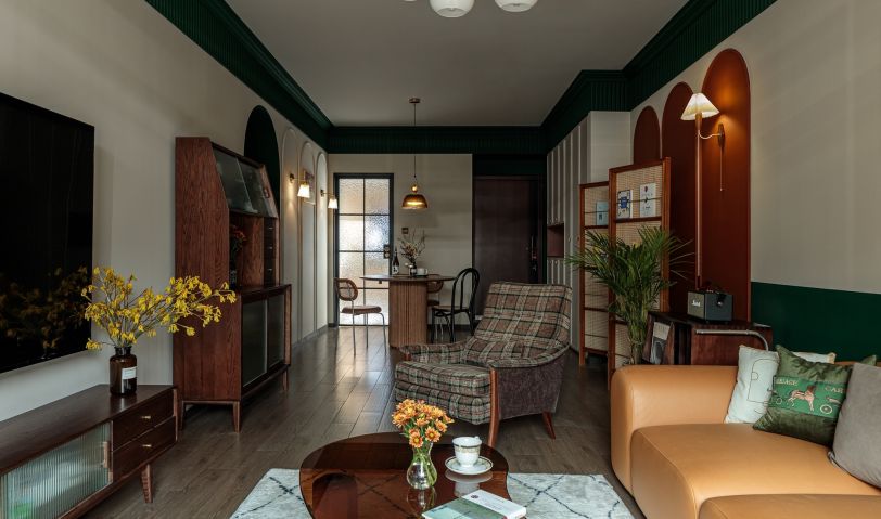 以色塊為墻體造型,壁燈、復古掛畫、都是屋主喜愛的配飾成品,將這些集合為空間的故事素材,進一步豐富墻面的質感。在紅綠之間融入淡金色沙發,本身自帶的精致復古氣息,流連的金屬味道香醇而低調,散發出舒適的溫暖氣氛。