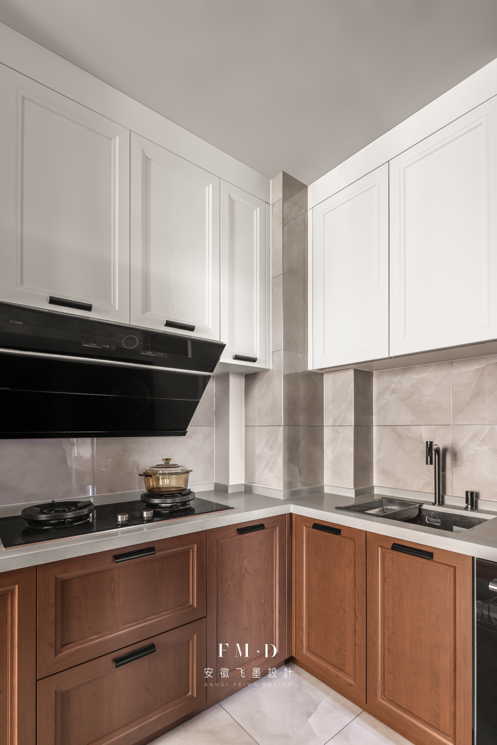 中廚區是高效的L型布局,同樣由飛墨工廠定制呈現,淺胡桃木與白碰撞,讓充滿柴米油鹽的日常也顯得溫馨美好。