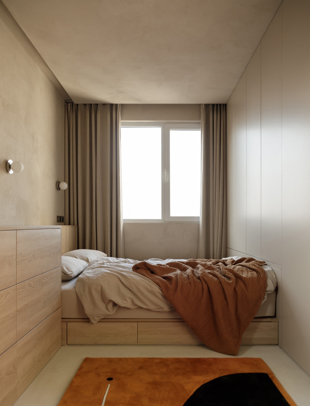 橘色的蓋毯和地毯也算空間里的亮色點(diǎn)綴,和客廳的配色相呼應(yīng)