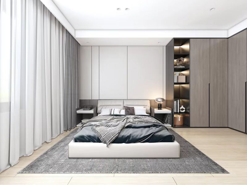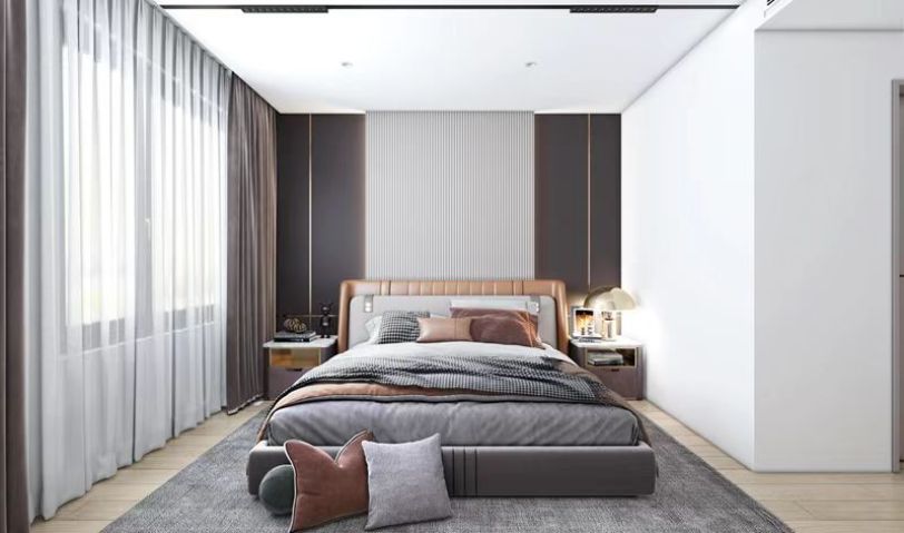 主臥呼應(yīng)客廳,使用皮質(zhì)床體配深色墻板。