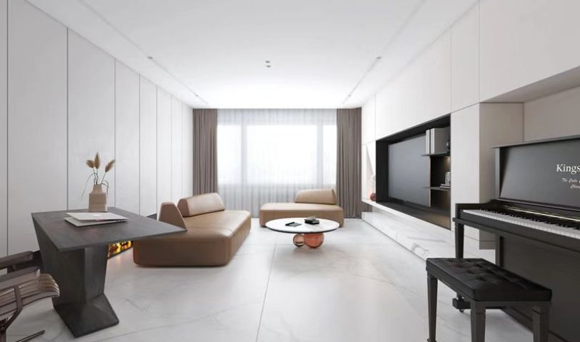 整個(gè)空間做無主燈處理,以白色為主,柜子造型簡(jiǎn)單無拉手,搭配皮質(zhì)沙發(fā)讓整個(gè)空間更有質(zhì)感。