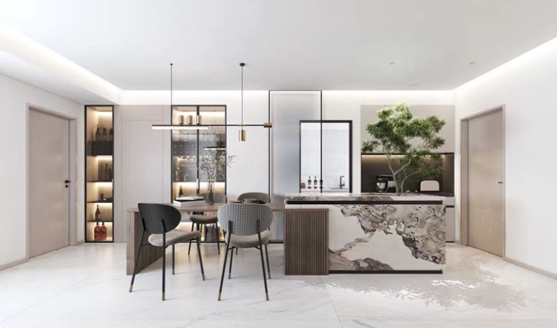 餐廳設(shè)置島臺(tái)+餐桌,島臺(tái)區(qū)域正對(duì)著入戶方向做一個(gè)造景,餐邊柜做玻璃柜門增加燈光效果讓整面墻有一個(gè)層次感。