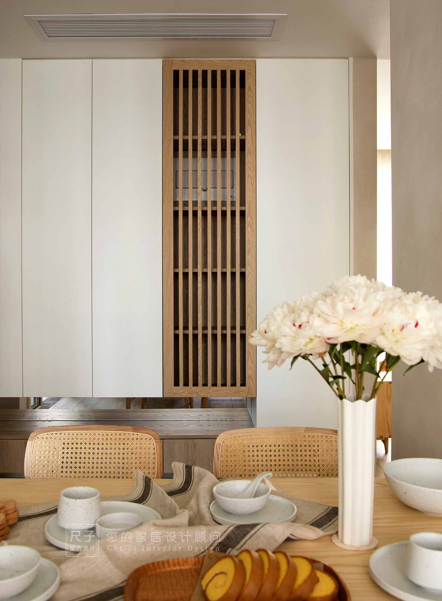 原木餐桌、藤編元素的餐椅給空間增添了一抹古樸的自然感,鮮花與枝葉點綴其中,為空間注入一股明媚的生機。