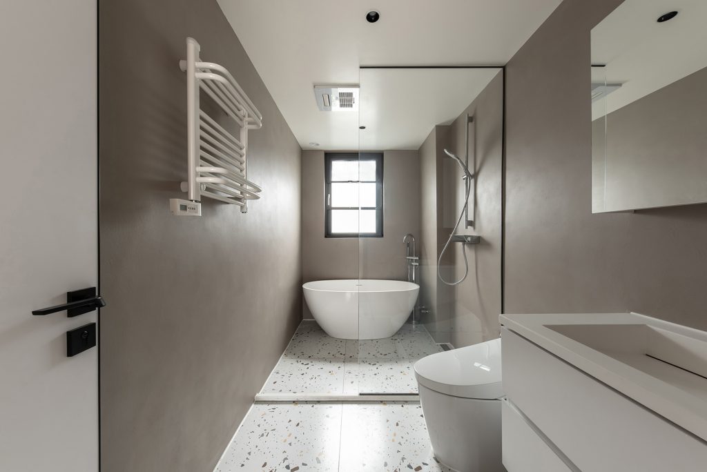 衛(wèi)的整體材質(zhì)與外部保持一致,微水泥上墻,地面鋪水磨石地磚,中間利用固定的玻璃做為干濕分區(qū)的隔斷,既不影響采光,也不影響美觀,入墻式水龍頭讓洗漱臺更為簡潔。