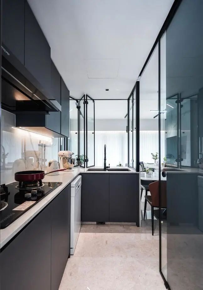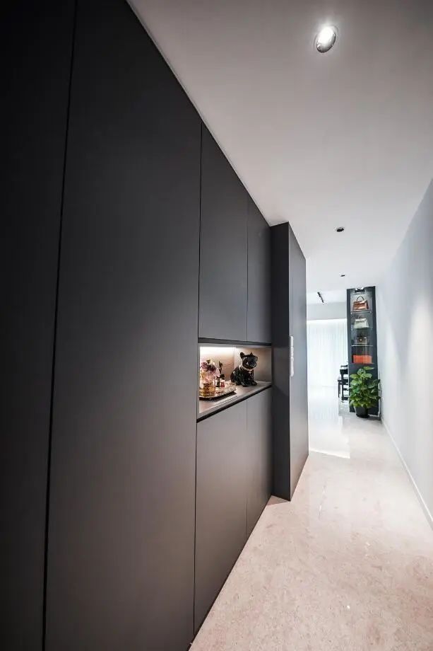 進門一條長走廊,業主給利用起來裝上一排頂天立地式的柜子,收納量猶如一間衣帽間一般,并且黑色的柜體,給人穩重的視覺效果,在進門的那一刻就給人留下了深刻的印象。