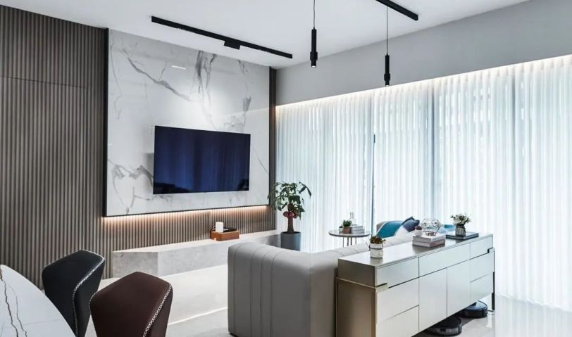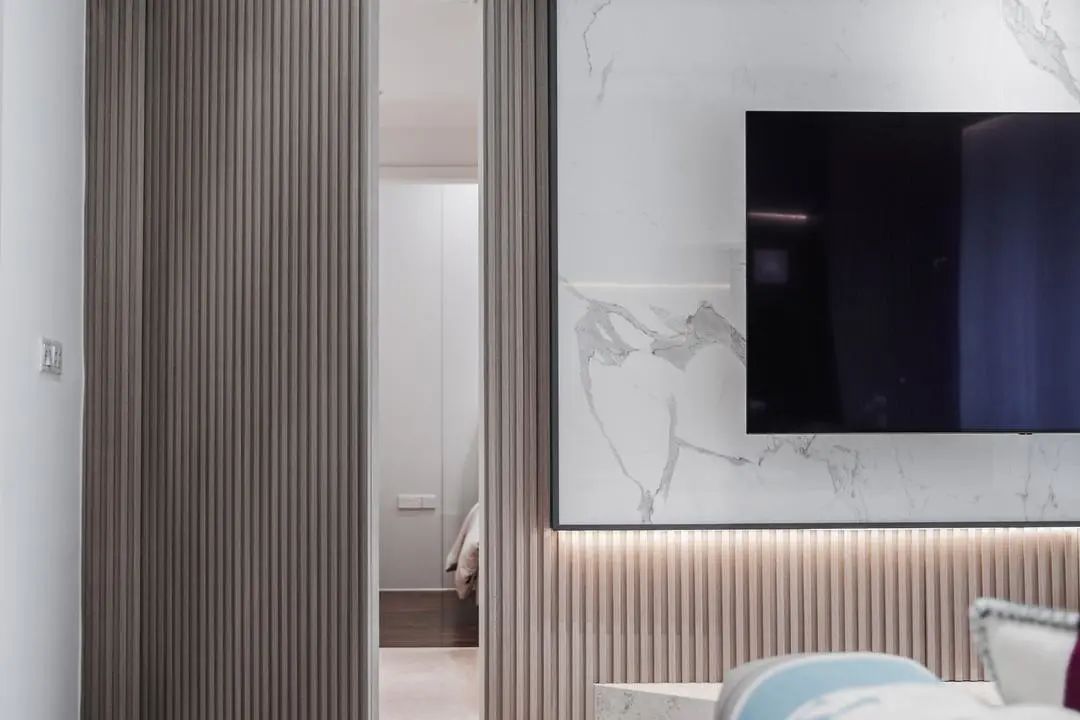 客廳背景墻旁做一體式的隱形門,設計上更有美感,視覺上延長了電視墻的寬度,起到了很好的裝飾效果。