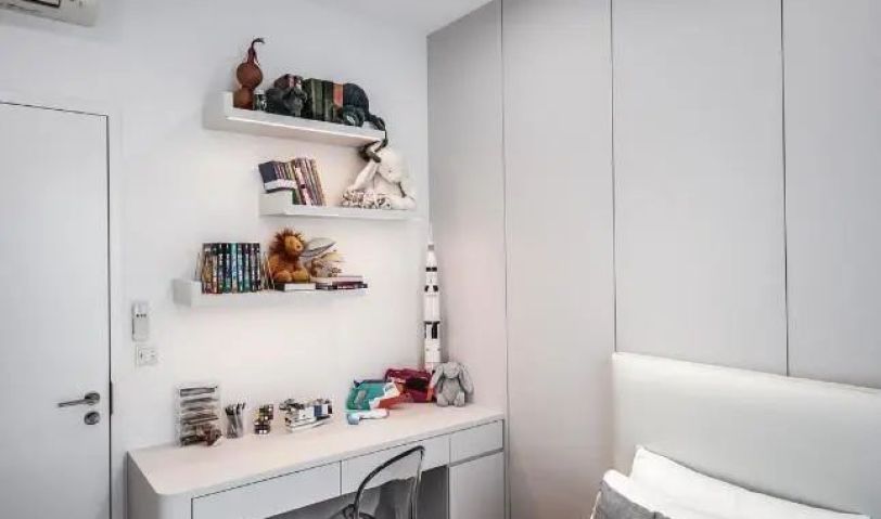 沙發不靠墻,后方的空間騰出來打上柜子留出鋼琴的擺放位置,將這里打造成多功能房使用,給居者預留出一個陶冶情操的空間。