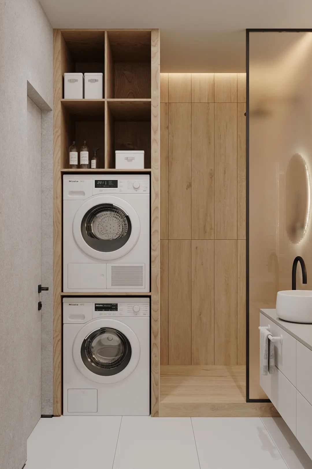 馬桶后方空間用于擺放常用洗漱用品,純白色調融合原木,自然而清新。