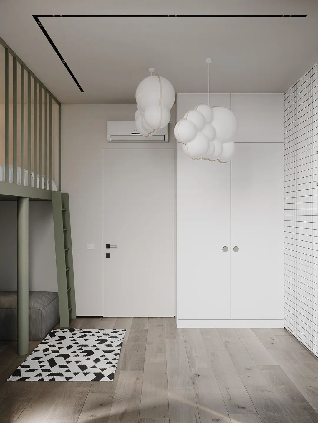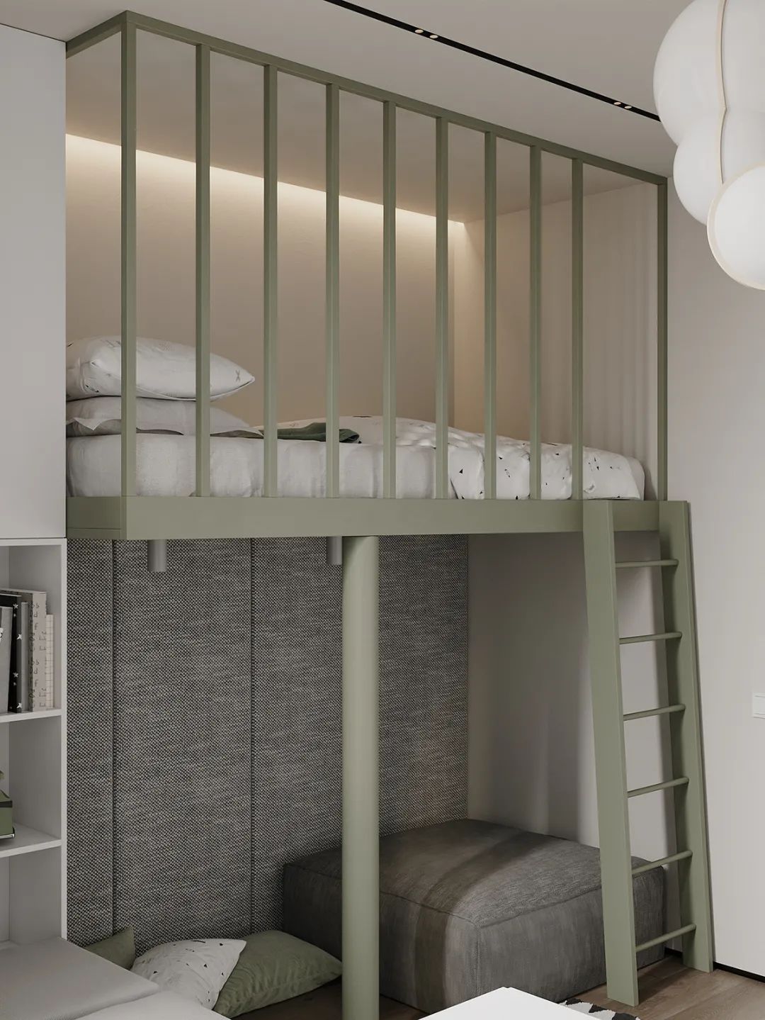 墨綠色高床+攀爬架,既滿足了孩子好動的天性,也高效利用了層高的優勢。墻面更是加了軟包,貼心地做好安全防護。