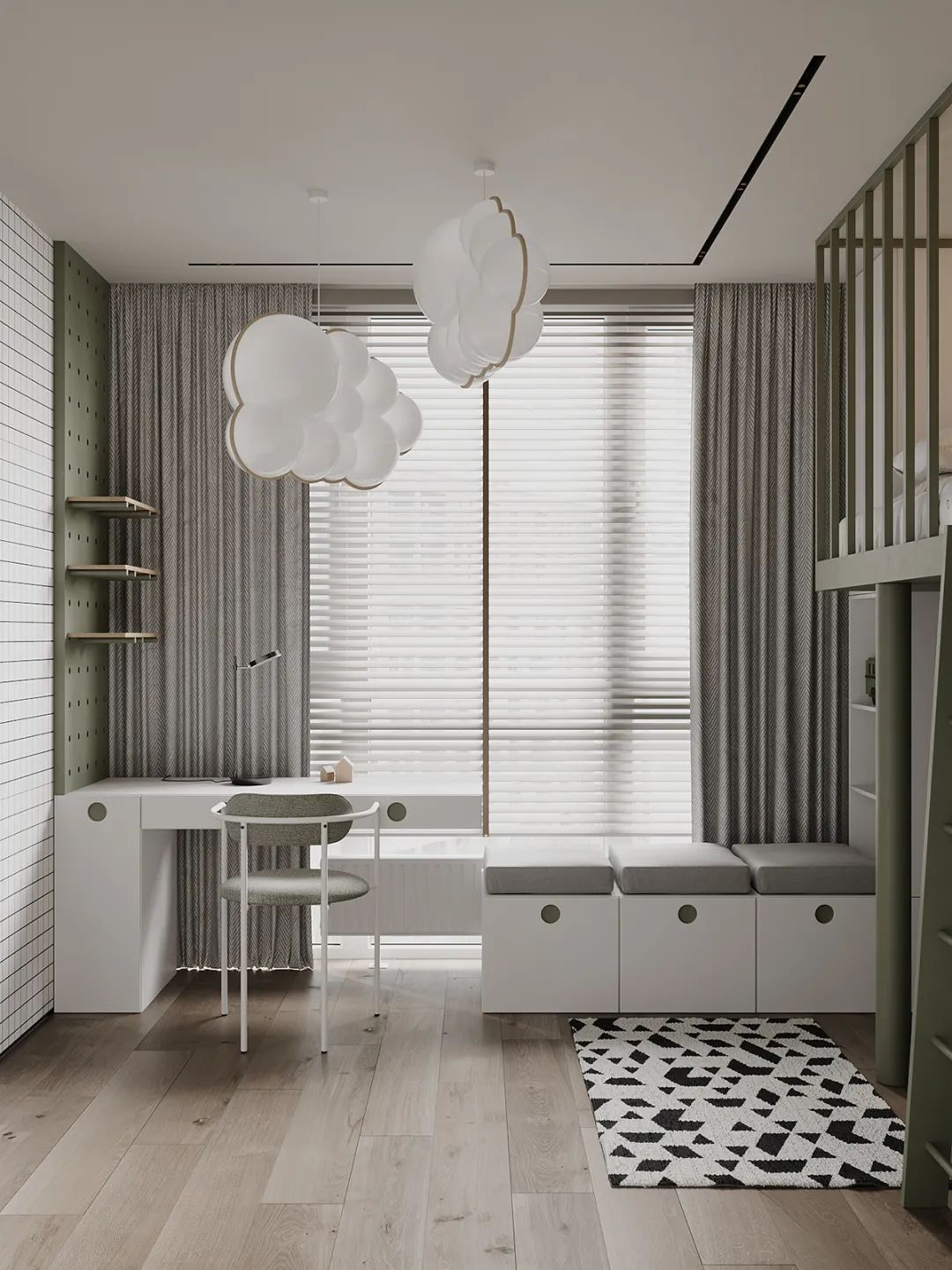 兒童房目前兼用作書房,綠+白組合讓視覺頓時清爽起來,洞洞板搭配小書桌,在云朵燈的照射下,透著浪漫和輕松。