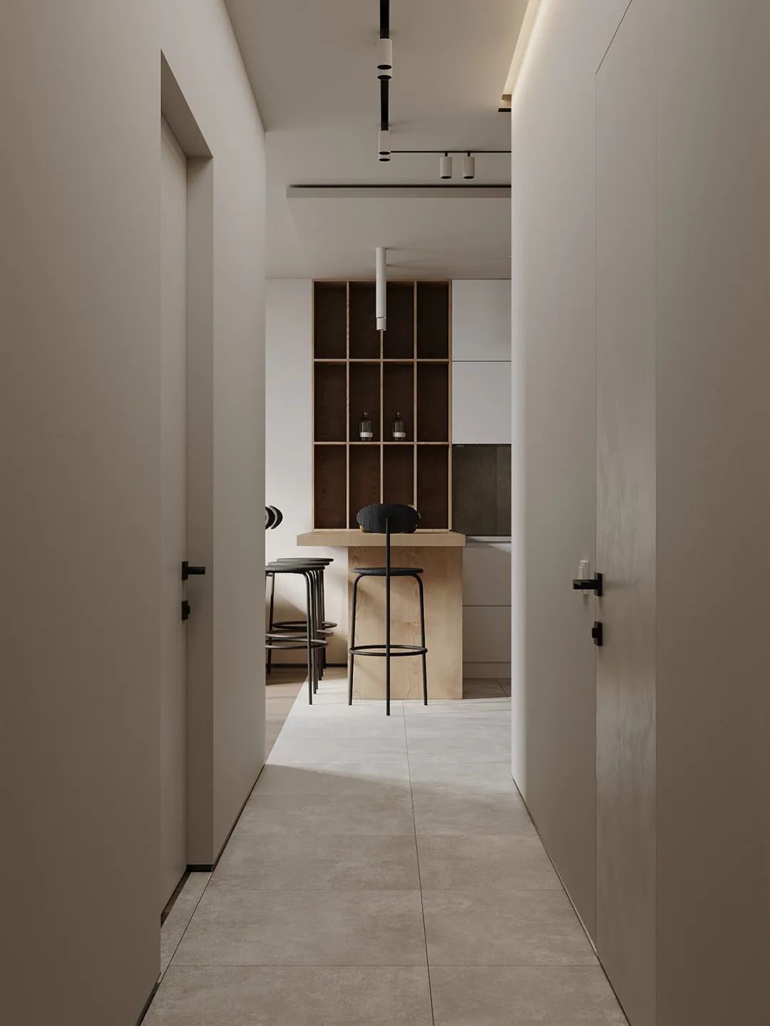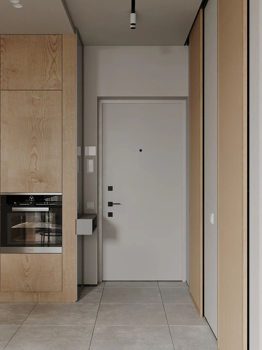 狹長的玄關正對開放式廚房,考慮到兩側都是屋門,且入戶門緊貼兩側墻體打不了柜子,因此將玄關柜納入公共儲物空間,以保證正常的行走。