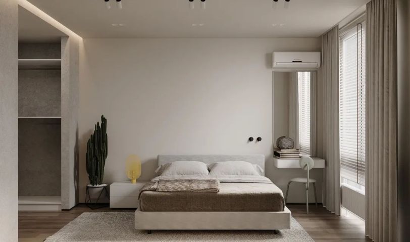 睡眠空間選用低飽和度的色彩平靜而優雅,一側床頭柜用于放置手機等雜物,靠窗一側是迷你梳妝臺,懸空設計清爽利落,偶爾還能用來臨時辦公。