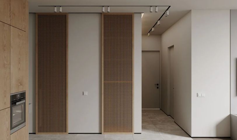 沿軌道燈向前,步入室內。寬敞的儲物空間由衣帽間+玄關柜組成,在原先屋門的基礎上增加兩道吊軌推拉木門,串聯起回家后的收納動線。