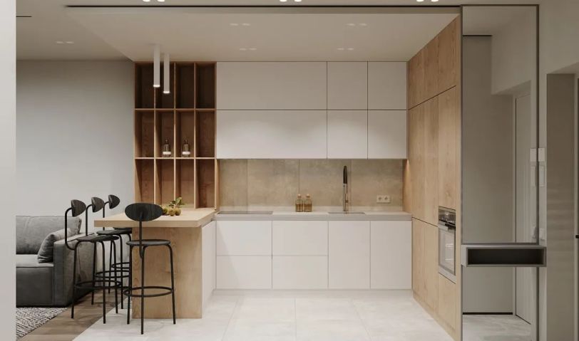 原木色+白色櫥柜干凈百搭,釋放出舒緩的氣息,無把手的設計減少磕碰,U型布局動線合理高效,嵌入式家電極致利用空間,小廚房也能“五臟俱全”。