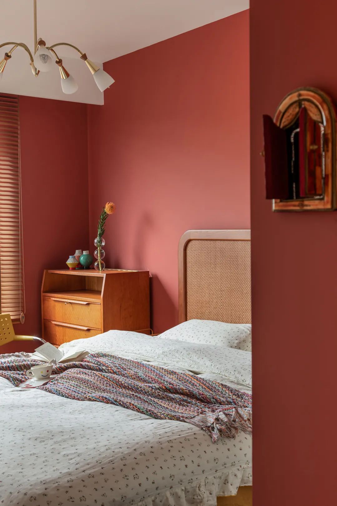 主臥空間朱砂紅為主色調,選用了很有歲月感的編織床頭和柚木床,空間優雅、知性有年代感,同時多了一份自然意趣。