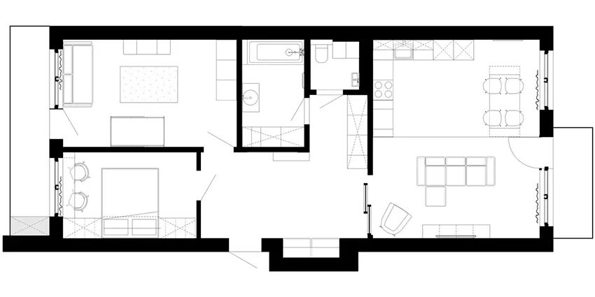 1. 南北兩側一分為二,兩間臥室和客餐廚區域徹底分開,中間采光稍弱的區域留給衛生間、玄關等功能性空間。