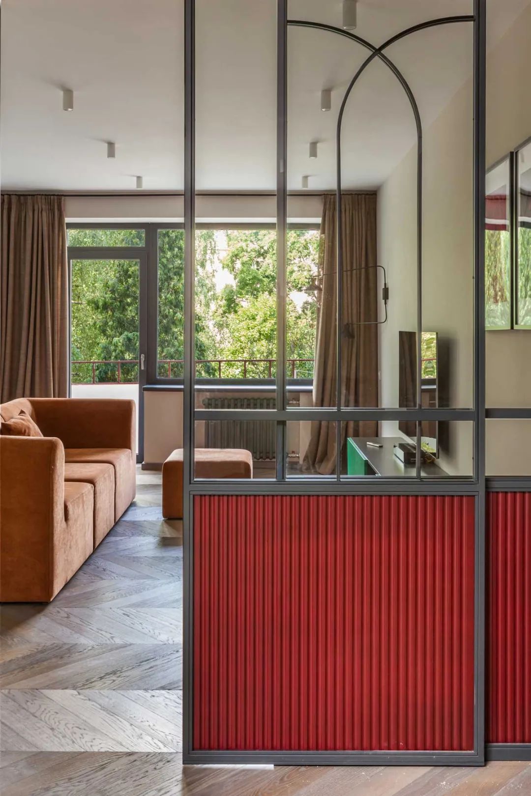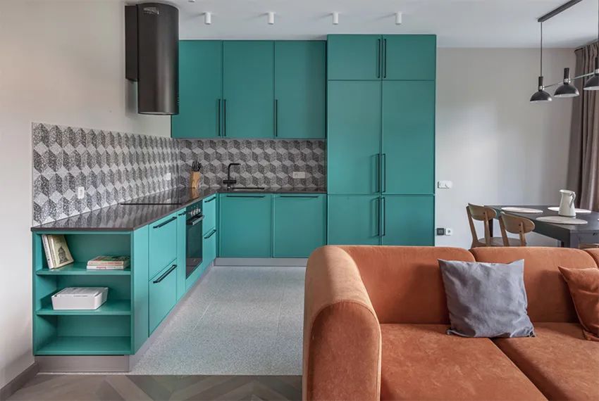 一扇玻璃推拉門,后面即是30㎡的開放式公共空間,同時將窗外的自然光引入玄關走廊。客廳、餐廳和廚房一體式布局,小空間更應減少隔墻,開闊通透。湖水綠廚具x棕黃沙發,色彩鮮明有質感,引導屋主回歸記憶中的時光。