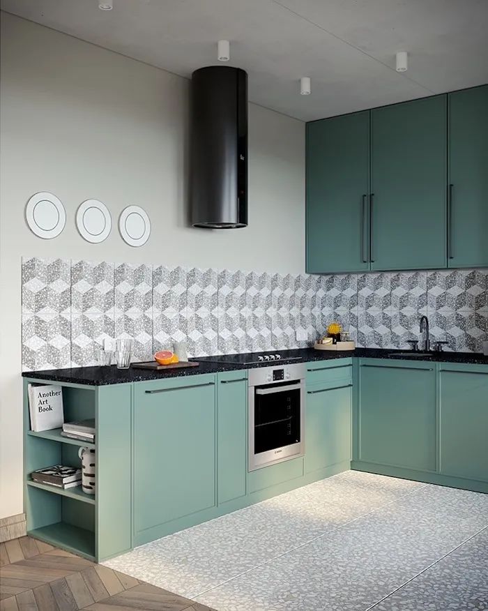 水磨石磚和魚骨拼木地板分隔餐廚和客廳,櫥柜側面設計開放柜格,擺放書籍、水杯等使用頻率較高的物品,增加客廳的收納空間。