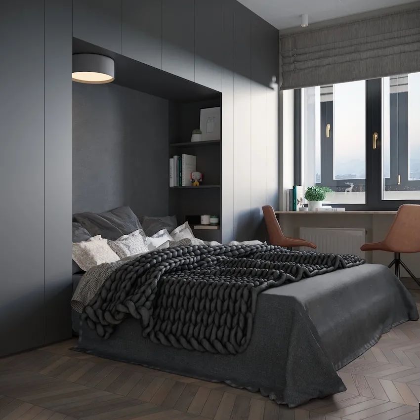 主臥面積有限僅10㎡左右,高柜+床榻一體式設計,靠窗還增加了書桌臺面,麻雀雖小,兩個人住也足夠了。