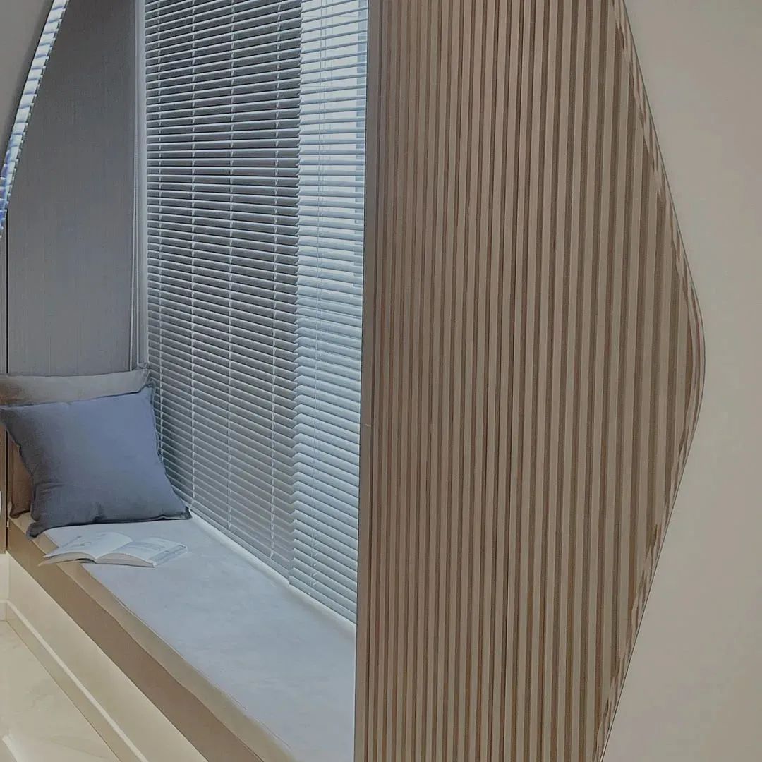 主臥背景采用的是墻布包波浪板結合木飾面的設計。