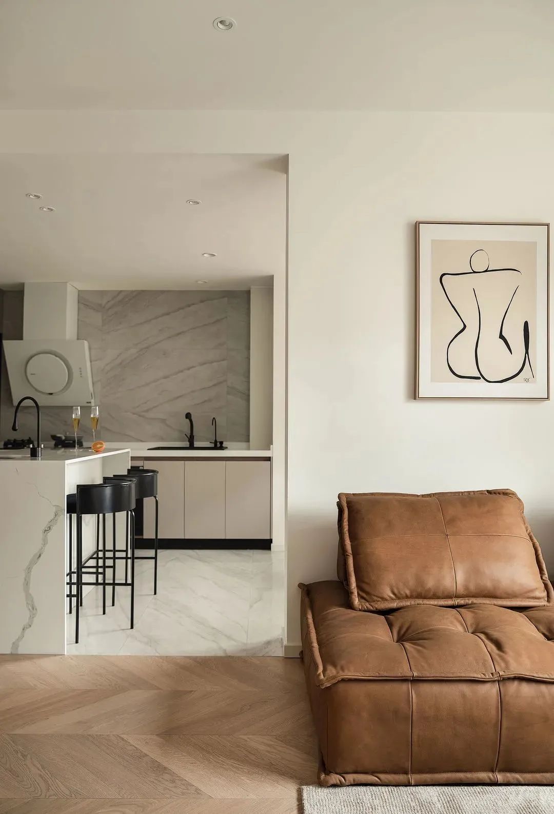 客廳看向廚房的角度,餐廳、廚房和客廳空間都打開,雖然房子只有82㎡,也顯得開闊通透。