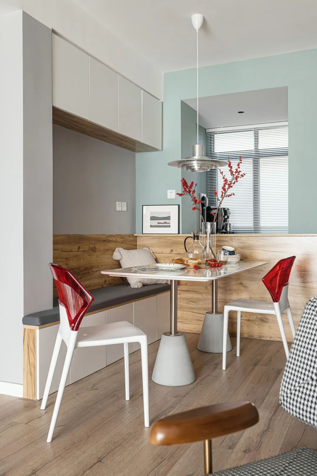 考慮到玄關柜占用一定空間,餐桌如果正常擺放,餐廳面積會緊張局促。所以定制了1800mm長的餐桌,并設計為靠墻卡座形式。